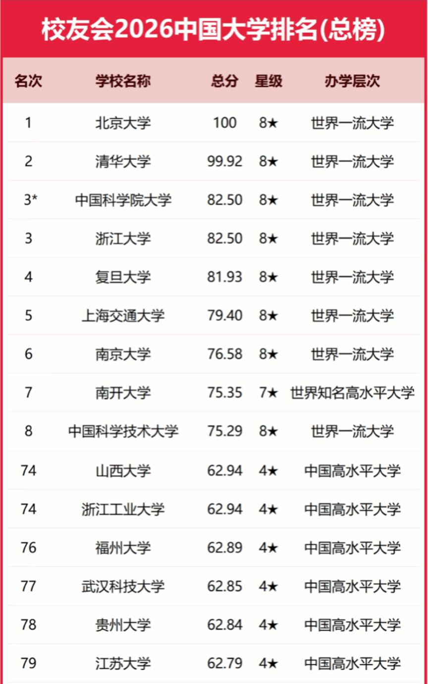 艾瑞深校友会中国大学排名至今已连续第24年发布,已成为具有广泛社会影响力、公信力、参考价值与创新力的中国大学排名领先品牌。校友会2026中国大学排名评价指标体系由办学层次、思政教育、教学质量、高层次人才、杰出校友、学科专业、科研基地、科研项目、科研成果、社会服务、社会声誉和国际影响力等12大一级指标组成,基于“大平台、大团队、大项目、大成果、大校友”体系框架展开系统评价,涵盖的评价指标达900多项。